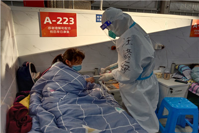 方舱内收治的患者分布各个年龄段,但绝大多数为轻症或无症状,医疗队完全按照“医院”内核行医,医护搭班成组,每天交班、查房、开医嘱、给予对症治疗,做好健康监测。除了必须的医疗护理,医疗队把人文关怀和心理疏导作为非常重要的部分,健康的心态有助于康复,医疗队尽可能地安排好患者在方舱内的隔离生活。为此,护理部组建了“宣传组”“文娱组”,有喜欢跳舞的女性患者,跳起了广场舞;有上班一族,在电脑前“居家”办公;更有学生朋友要学习考试,医护人员主动让出办公桌,满足患者需求,尽量提供洁净、便捷的物资用品,创造一个舒适、规范的隔离环境。而令医疗队欣慰的是,一些症状较轻的患者主动做起了志愿者,协助安排床位,一起缓解患者紧张的心理压力。